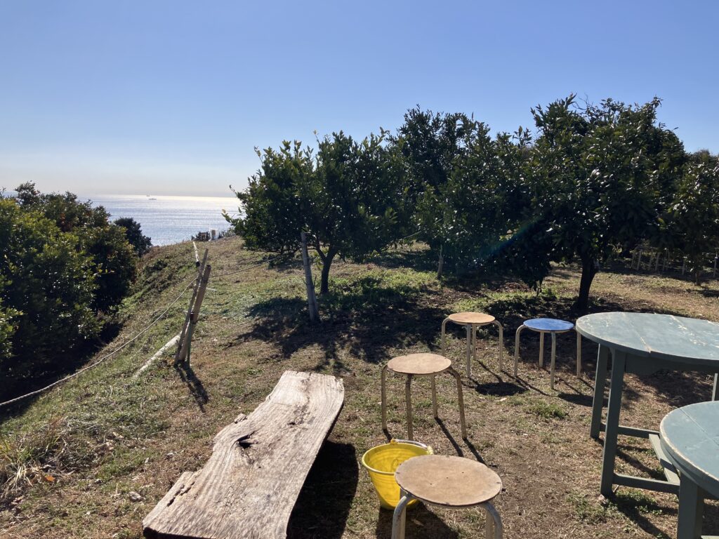 おじさんの「奥に休憩所あるよ」の声に誘われ、まだ歩き始めたばかりにも関わらずミカン畑の中へ