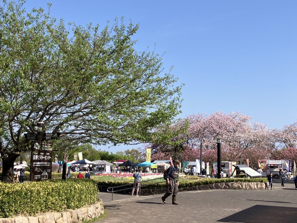 チューリップと桜が見ごろを迎えており大勢の観光客でにぎわっている